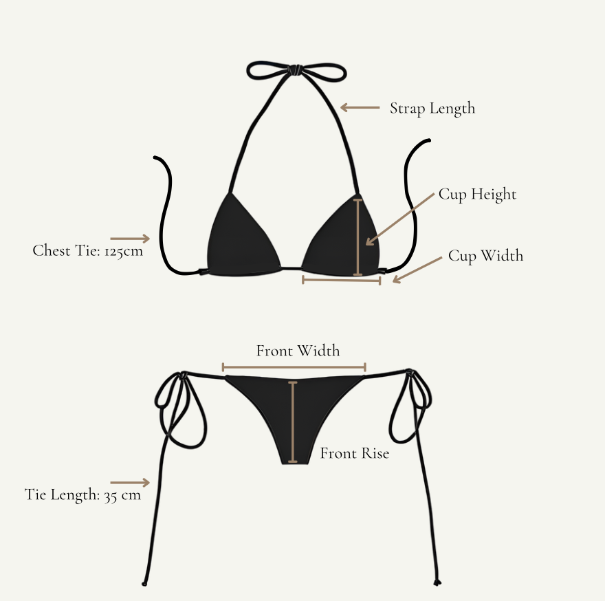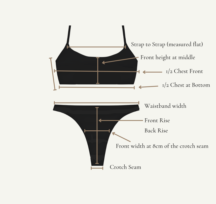 We recommend measuring a bikini that fits you well and comparing it with the measurements provided below to find your best match.