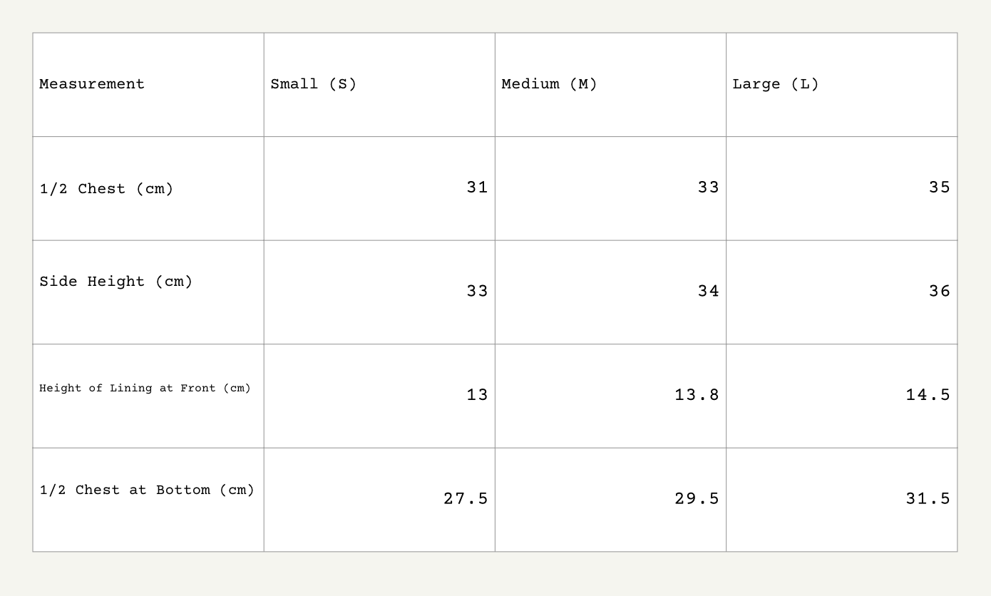 This collection includes three sizes with minimal differences between them. Due to limitations in our current production run, the sizing does not follow conventional standards. Please keep this in mind when selecting your size. We are actively updating our sizing approach for future collections.